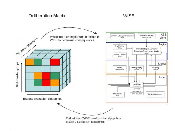 The Deliberation Matrix - a three-dimensional Deliberation Matrix, or “Cube”, as a framework for presentation of the judgements offered by each stakeholder class should offer a judgement (e.g., satisfactory, poor, intolerable, etc.) of each scenario in relation to each of the key governance or decision issues. In an iterative process outputs from the deliberation process can be evaluated in the quantitative simulation model WISE, following by another deliberation process using the model outputs (see below).